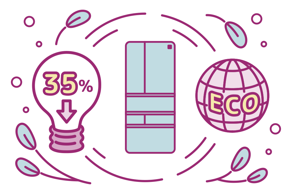 - ※つないでもっと節電ON(自動製氷一時停止モード時)と通常運転(自動製氷運転時)との比較。電力の消費を抑えた運転をするために、食品保存に影響を及ぼさない範囲で、庫内温度を約2~3℃高めに設定します。設定温度「中」、新鮮冷凍「切」、周囲温度35℃、ドア開閉なしでの1日当たりの消費電力量から算出。SJ-MF61R:通常運転(自動製氷運転時)1.788kWh→節電25モード(自動製氷一時停止モード時):1.294kWh→つないでもっと節電ON(自動製氷一時停止モード時)1.132kWh。JIS C 9801-3:2015測定基準とは異なります。使用環境(温度調節・周囲温度・ドア開閉頻度・食品の量など)により節電効果は異なります。無線LANへの接続が必要です。