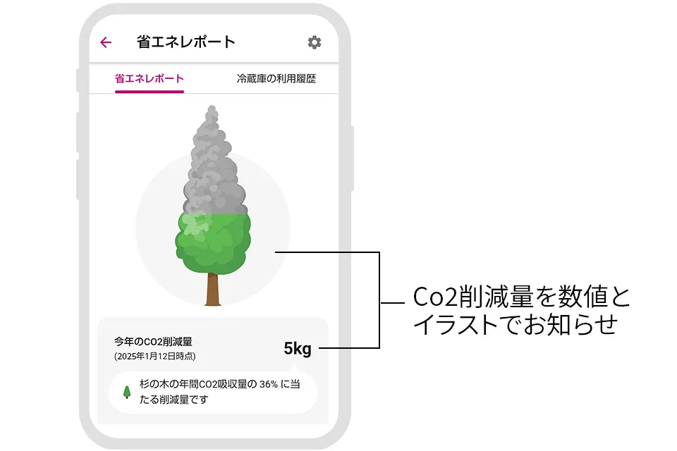 ご家庭でどのぐらい省エネしたのかをスマホで確認できます。CO₂の削減量を数値で示すので、環境への貢献度もより意識しやすくなります。また、ドアの開閉回数をグラフ化してスマホで確認でき、節電意識の向上につながります。