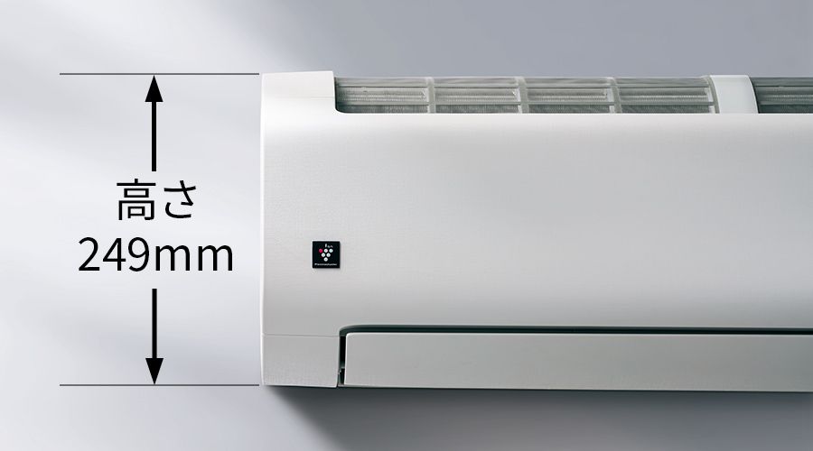 - 国内家庭用エアコン目標年度2027年省エネ基準達成モデルにおいて。2.2kW、2.5kW室内機高さ249mm。2025年12月現在。(当社調べ)