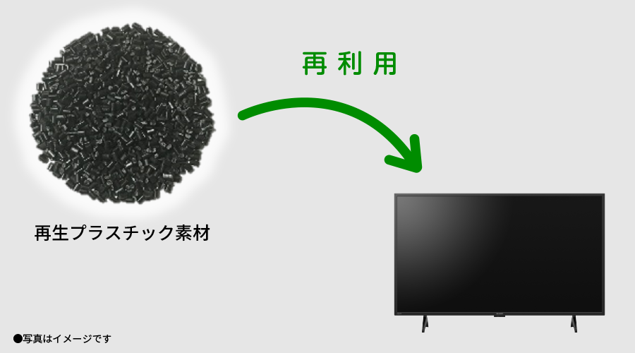 使用済み家電を回収し、再生プラスチック素材を生成。テレビの部品の一部に再利用しています。
