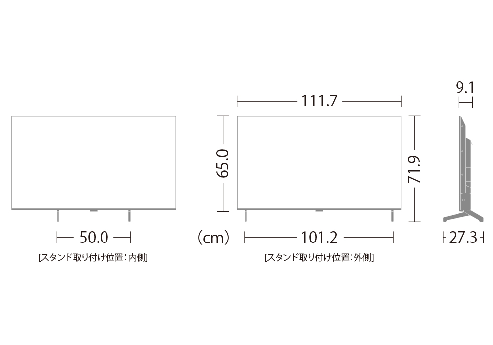 | 外形寸法(幅×奥行×高さ)※1 | ①111.7×27.3×71.9cm / スタンド幅:101.2cm〈外側時〉 50.0cm〈内側時〉 ②111.7×9.1×65.0cm |