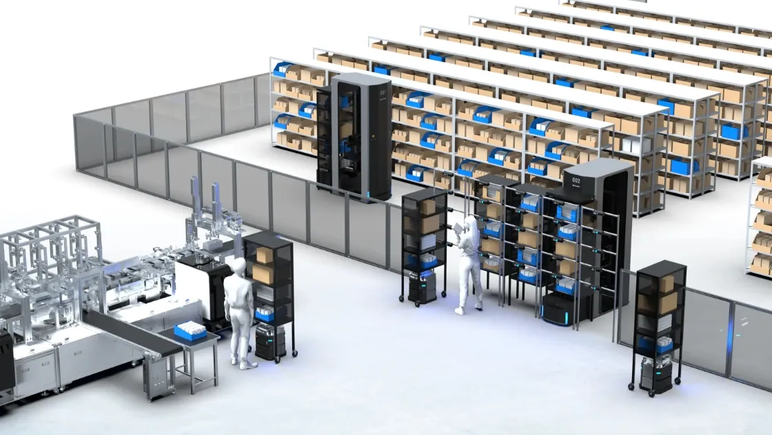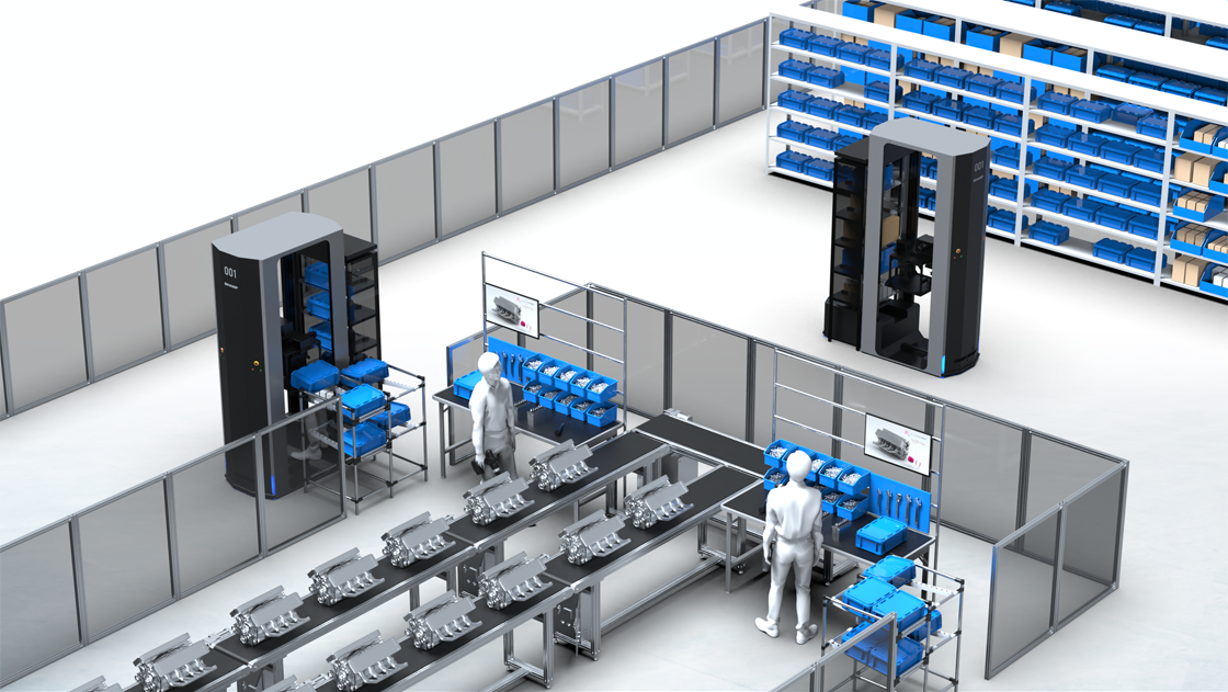 生産に必要な部品をスリムスタッカーロボットストレージで集め、キッティングした台車をAMRで搬送