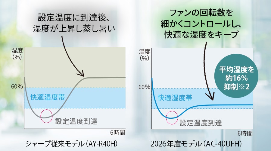 冷房運転中は設定温度に到達すると冷房運転を弱めるため、十分な除湿ができず湿度が上がってしまうことがあります。 匠の冷房はファンの回転数を細かく制御、熱交換器の温度を調整することで、温度はもちろん湿度までコントロールし、サラッと快適な冷房を実現します。