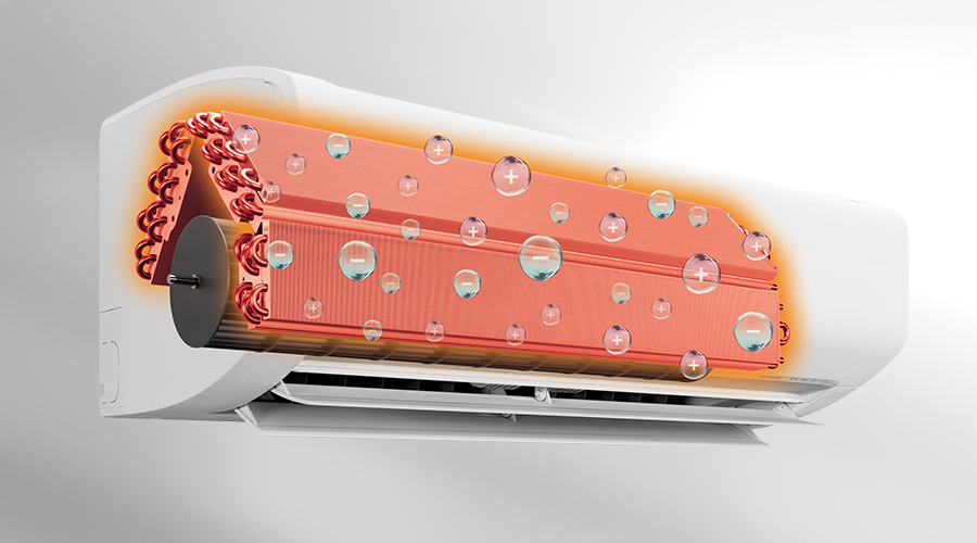 エアコン停止中に、カビが生えやすい環境を検知すると運転をオン。ファンを逆回転させることでエアコン内部の空気を動かすとともに、高濃度イオンで満たし、カビ菌を除菌します。(送風路)