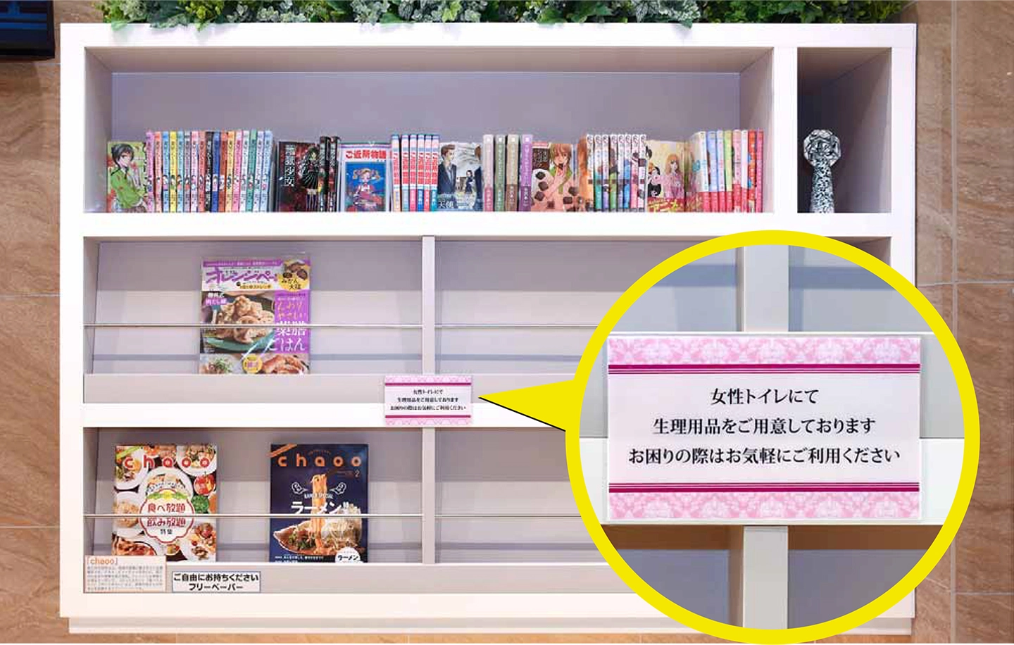 店舗の女性専用休憩室で生理用ナプキンの提供をご案内