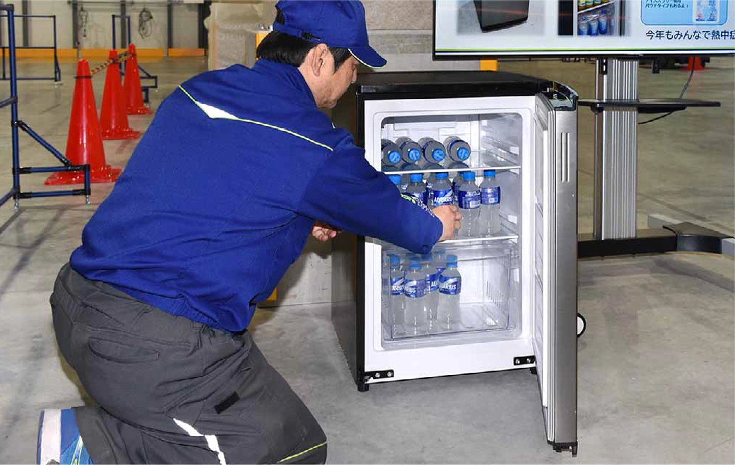 アイススラリー冷蔵庫は、カラダの中から暑熱対策ができる飲み物“アイススラリー”を、市販のペットボトル飲料などを一定時間入れておくだけで簡単に作ることができます。