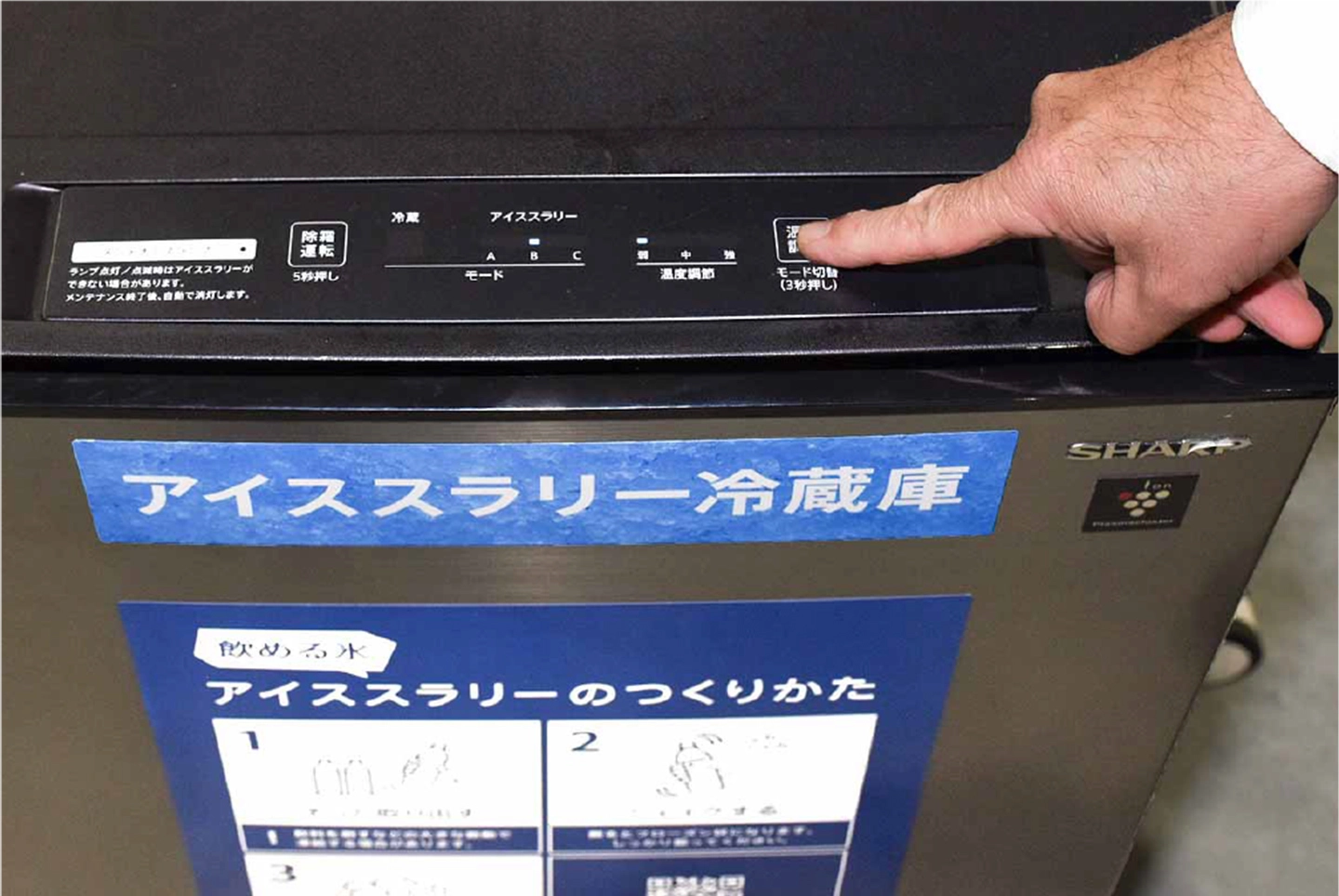 昨年、熱中症対策が義務化された際、本社から対策商品としてアイススラリー飲料を紹介されました。冷凍庫で凍らせるとアイススラリーになる専用の飲料で導入を検討しましたが、十分な数量を入手できず断念。そうしたなかネットで見つけたのがシャープのアイススラリー冷蔵庫でした。専用飲料でなくても市販のペットボトル飲料を一晩冷やしておくだけで、簡単にアイススラリーが作れるのを第一に評価。スポーツドリンクなどさまざまな種類の飲料で作れることもメリットでした。