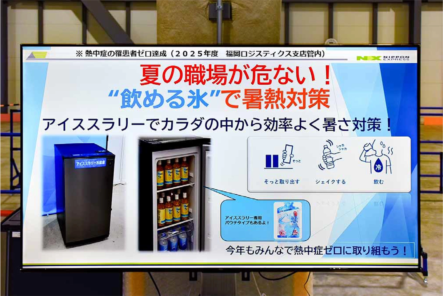 福岡ロジスティクス支店管内の17拠点に計19台をレンタルで導入しました。前夜のうちにスポーツドリンクなどを庫内に入れて準備しておき、朝アイススラリーになったものを作業に出る前に飲んで深部体温を下げるようにしました。従業員へのアンケートでは「体が長時間冷えている」「体幹のほてりがおさまった」「頭まですっきりした」と好意的な意見が多数でした。さらに現場からは「作業者の立場で本当に欲しいものを提供してくれた」と喜ぶ声も聞かれ、モチベーションアップに貢献しました。