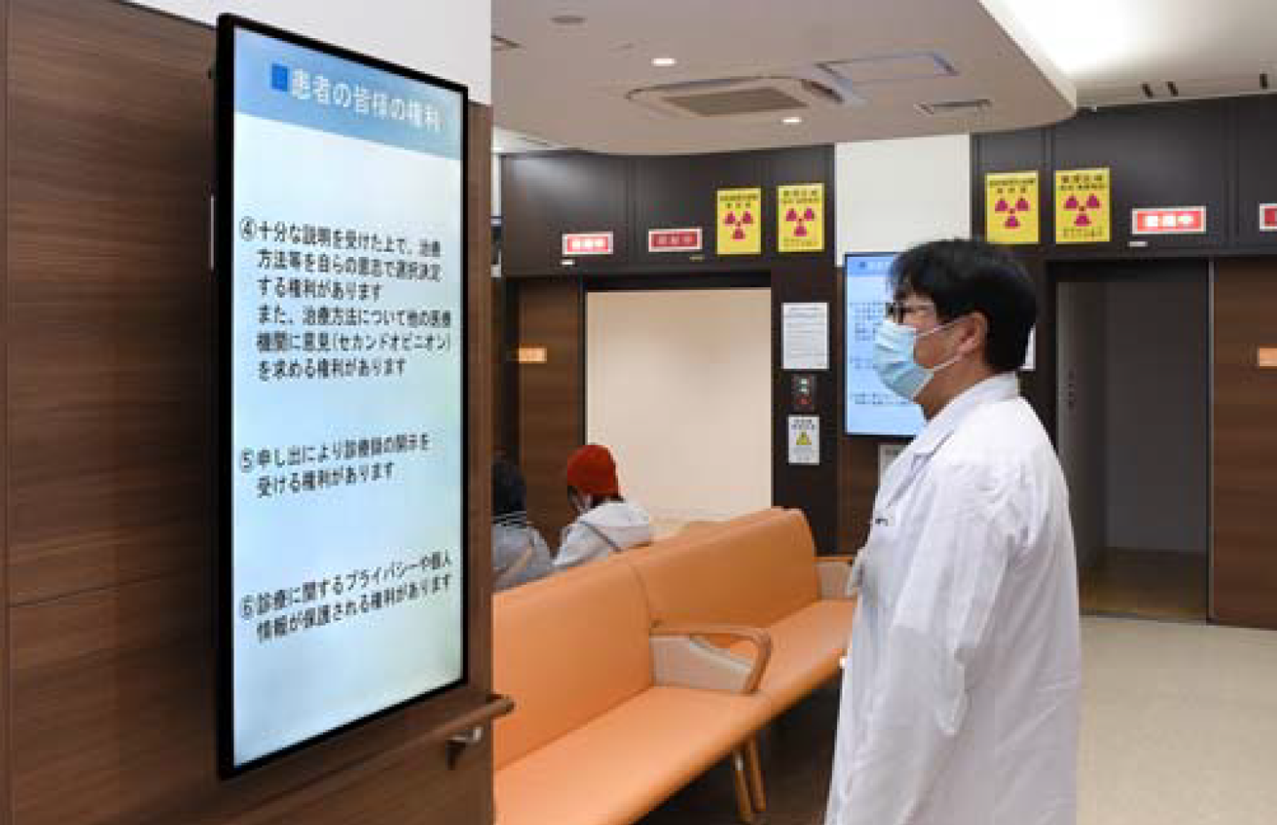 2023年12月、放射線治療棟の待合に壁掛け設置で導入。放射線治療の受け方など診療に関する情報を来院者に提供。