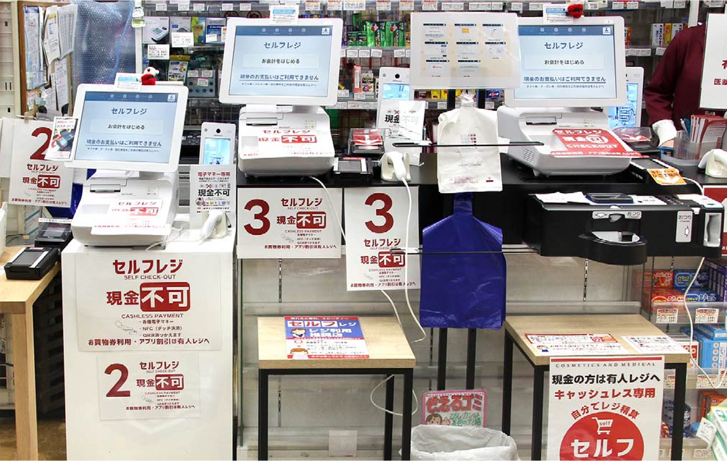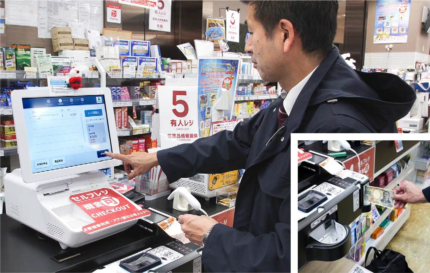 9店舗40台のリプレースを行いましたが、丸の内のオフィス街に立地する大手町ファーストスクエアドラッグでは、有人レジ4台、セルフレジ3台で導入。薬の相談をしたい方やクーポンを利用したい方などは有人レジ、昼休みのご利用などで買い物時間に限りのある方や非対面での購入を好まれる方はセルフレジを選ばれています。また、以前のセルフレジはキャッシュレス専用でしたが、今回、セルフでの現金決済対応に伴い、一部セルフレジにて自動釣銭機対応できたこともポイントです。