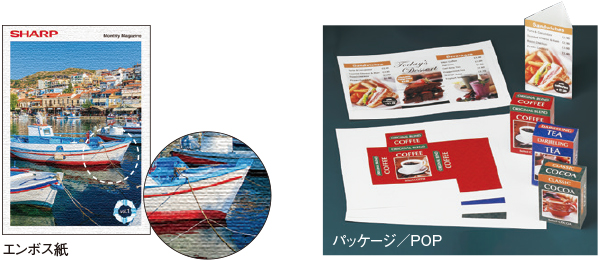 厚紙は最大300g/m2まで対応可能。220g/m2までの厚紙は普通紙と同じスピードで印刷できます※。さらにエンボス紙など多彩な用紙にも対応しているので、パッケージやPOP、冊子の表紙など、ビジネスシーンに求められるさまざまな印刷を多彩な用紙で実現します。高い表現力でビジネスをサポートします。