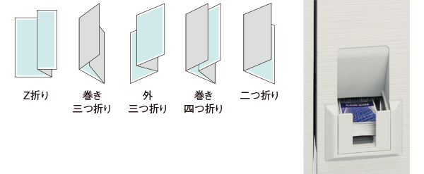 - 紙折り可能サイズ:Z折り(A3、B4、A4R)、巻き三つ折り/外三つ折り/巻き四つ折り/二つ折り(A4R)。A3、B4の二つ折りは、サドルフィニッシャー(BP-FN21)が必要です。