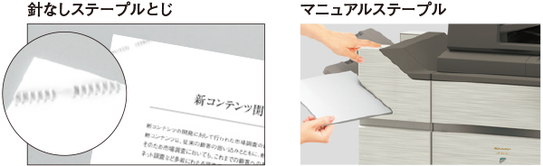 かさばらずきれいに仕上がる針なしステープル※1を搭載。また、その場ですぐにとじられるマニュアルステープル※2も使用できます。