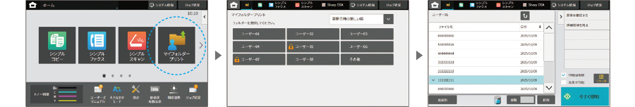 印刷文書をユーザーごとのフォルダーに自動で振り分けて本体ストレージに保存。管理の手間が省けるうえ、ミスプリントや印刷物の取り違え/混入を防ぐことができます。登録や設定の必要はなく、便利にお使いいただけます。