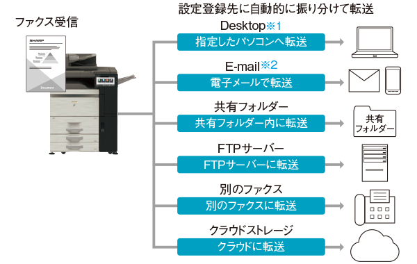 ファクスやインターネットFaxのデータを、TIFFやPDFデータに変換し、指定した共有フォルダーやE-mailなどに転送できます。