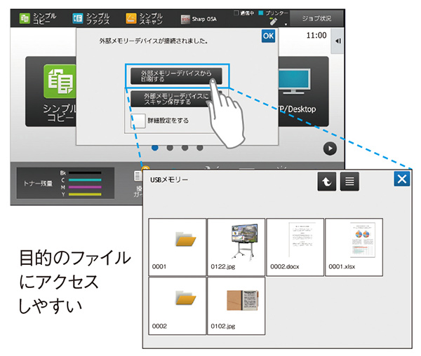 USBメモリーを挿入するとスキャン・印刷の選択画面がポップアップ。さらに印刷時、サムネイルプレビューでファイル内容をイメージで見ることができ、まよわずスムーズな操作が可能です。