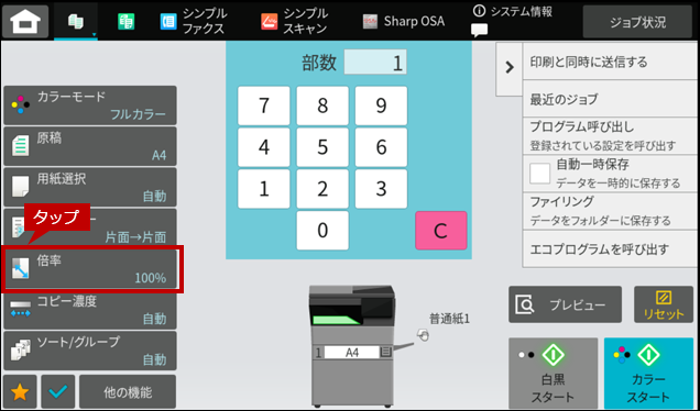 3. コピー基本画面が表示されますので、[倍率]をタップします。