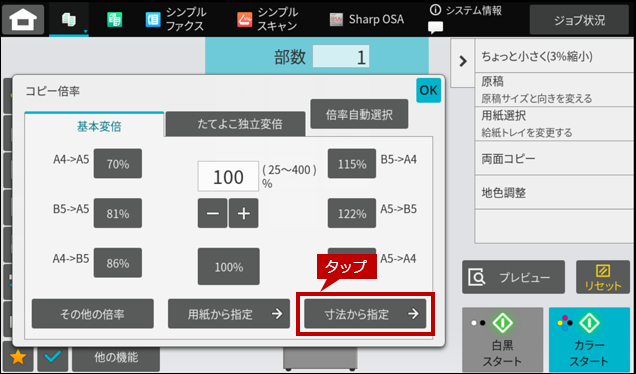 4. 「コピー倍率」画面が表示されますので、「基本変倍」の[寸法から指定]をタップします。