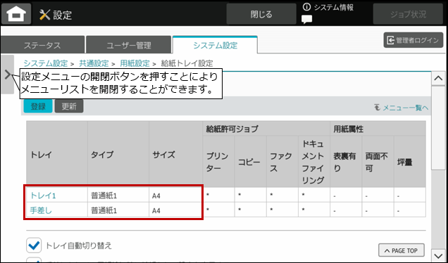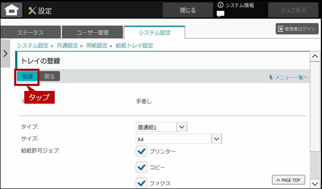 例)手差しトレイの登録画面