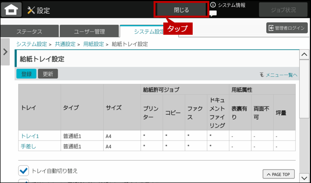 7. 「給紙トレイ設定」画面に戻りますので、[閉じる]をタップしてします。
