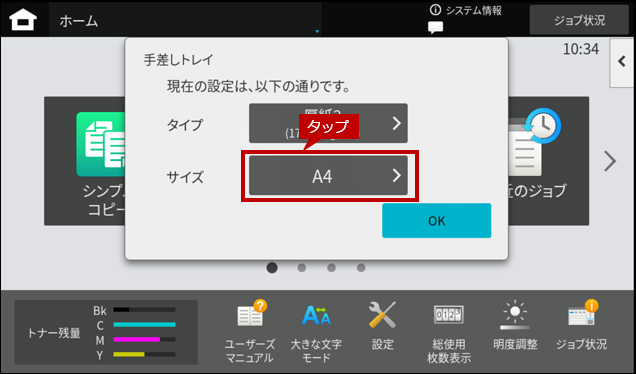 6. 「手差しトレイ」の設定画面に戻りますので、[OK]をタップします。