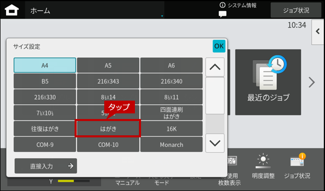 2. はがきをセットしますとホーム画面に「手差しトレイ」の設定画面が表示されますので[タイプ]をタップします。