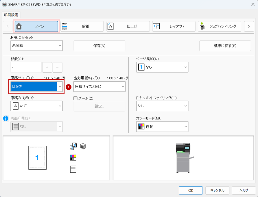 8.「プリンタードライバー」の設定画面で[メイン]タブを選択して、原稿サイズ(O)を「はがき」に設定します。
