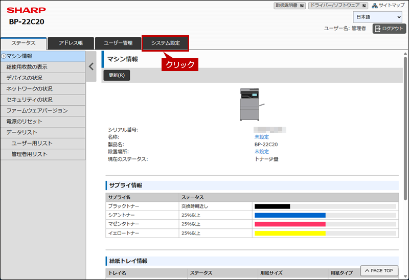 2. ブラウザに複合機の設定画面が表示されますので、[システム設定]をクリックします。