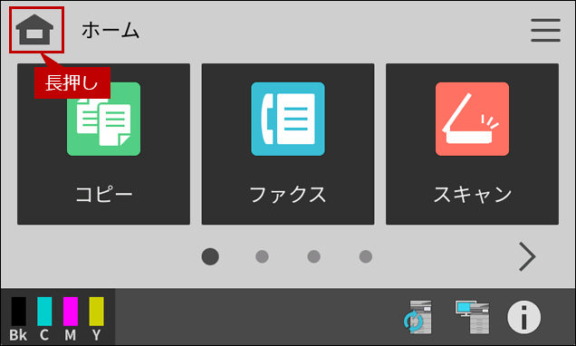 ホーム画面で[ホーム画面]キーを長押しすると、「総使用枚数/トナー残量表示」」画面が表示されます。