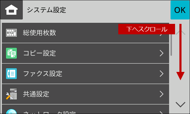 3. 「システム設定」画面が表示されますので、画面を下へスクロールします。