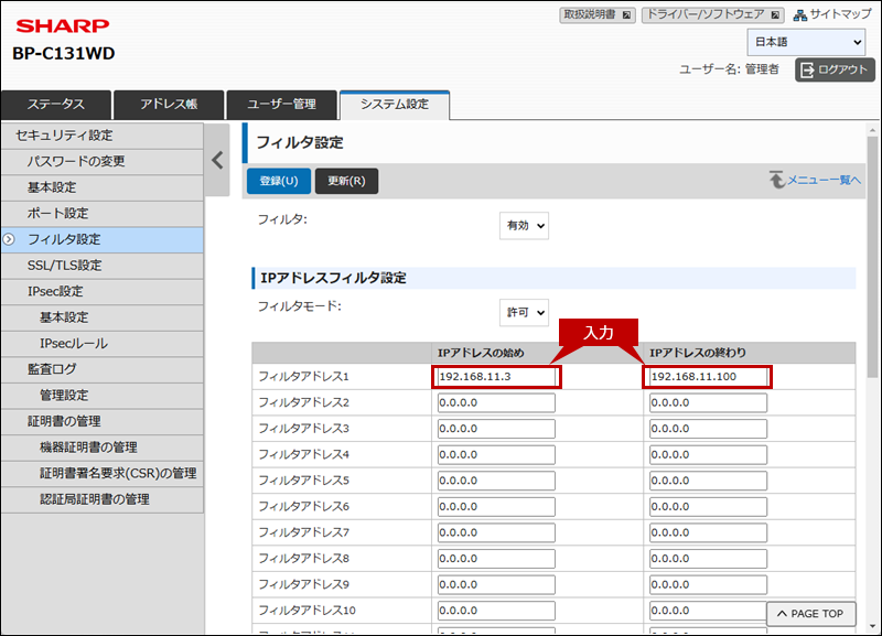 ここでは、「IPアドレスフィルタ」を「許可」にして、複合機へ接続できるIPアドレスを設定します。