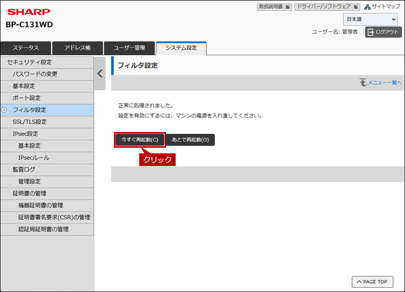 本体の再起動後にIPアドレスのフィルタリングが有効になります。