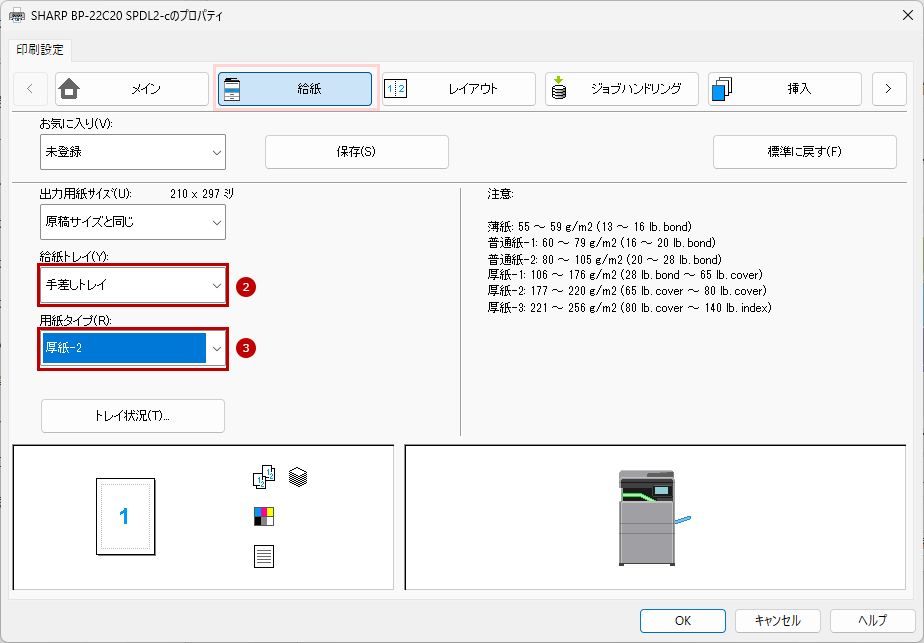 10. 次にプリンタードライバー設定画面で [給紙]タブをクリックし、給紙トレイと用紙タイプを設定します。