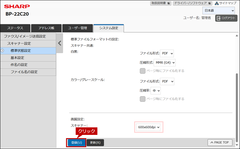 スキャン解像度の規定値(デフォルト値)を変更するには、「スキャナー設定」の画面で変更することができます。