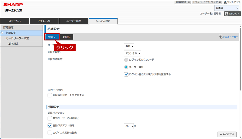 システム設定のユーザー管理で認証機能を有効後、ユーザーリストに登録されているユーザーに番号を割り当てることによって、ユーザー番号でログインすることができます。設定方法は、以下の手順をご覧ください。