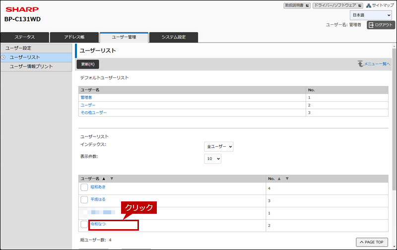 6. 「ユーザー設定」画面が表示されますので、権限を与える[ユーザー名]をクリックします。