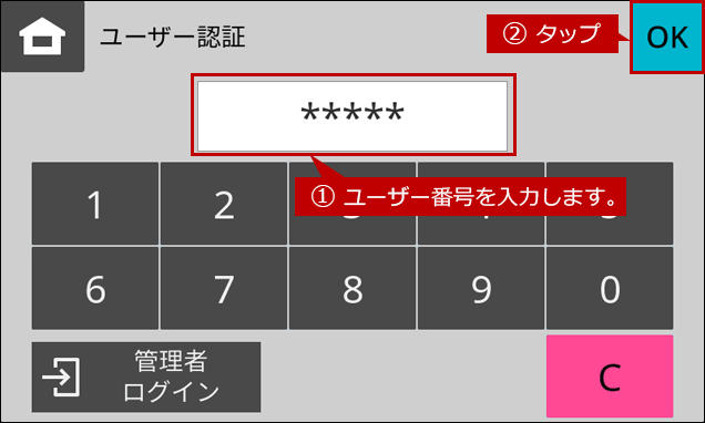 1. ユーザー認証画面でユーザー番号を入力して、[OK]をタップします。