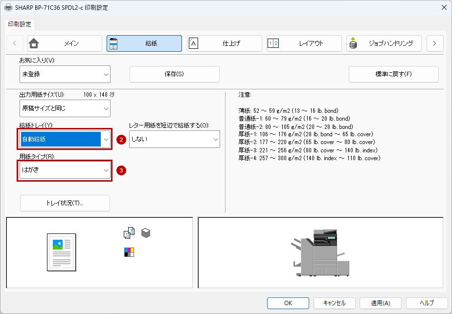 5. 次にプリンタードライバー設定画面で[給紙]タブをクリックし、給紙トレイと用紙タイプを設定します。