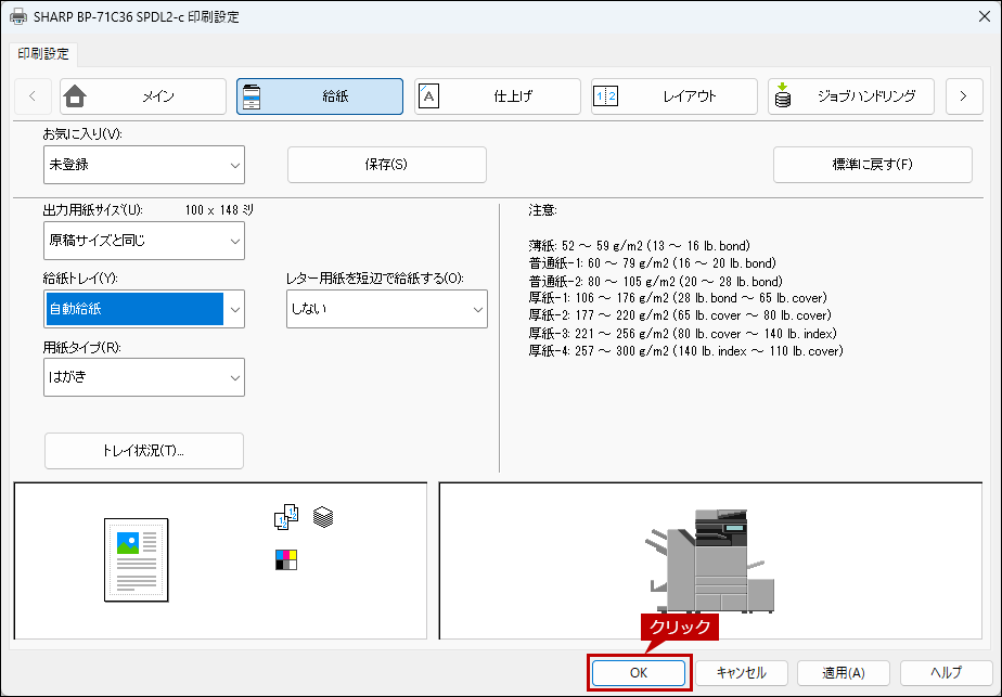 6. プリンタードライバー設定画面で[OK]をクリックして、印刷を実行します。