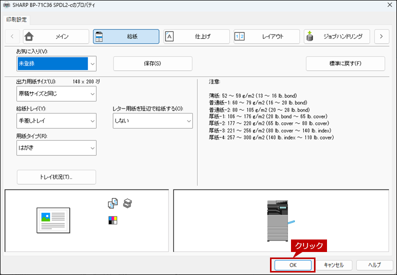 9. プリンタードライバー設定画面で[OK]をクリックして、印刷を実行します。