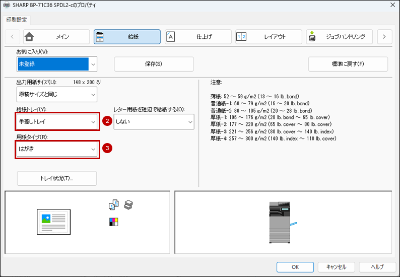 11. 次にプリンタードライバー設定画面で[給紙]タブをクリックし、給紙トレイと用紙タイプを設定します。