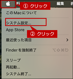 Appleマークをクリックし、表示されたメニューにある「システム設定...」をクリックします。