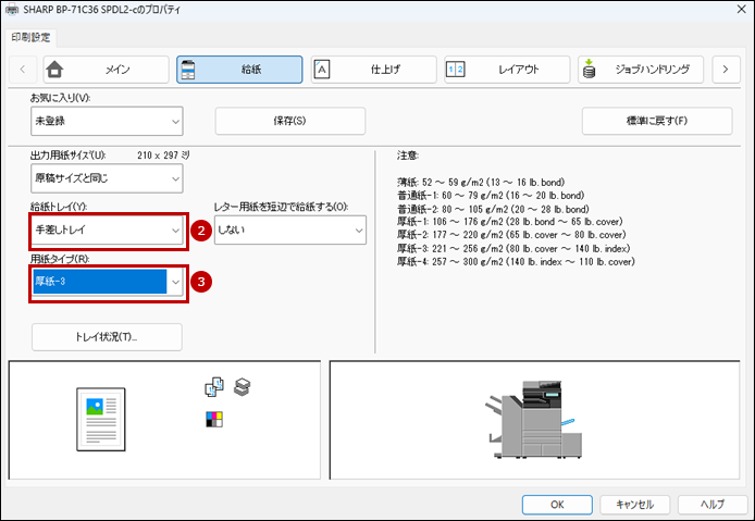 7. 次にプリンタードライバー設定画面で[給紙]タブをクリックし、給紙トレイと用紙タイプを設定します。