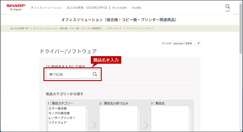 プリンタードライバーのダウンロードページ で、製品名を入力します。