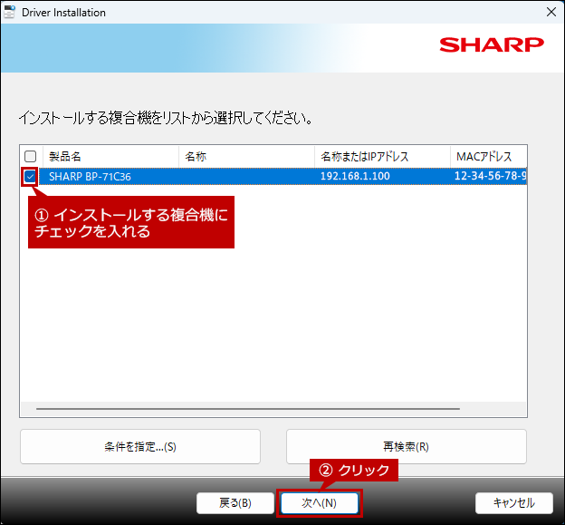 検索された複合機からインストールする複合機にチェックを入れ、[次へ]ボタンをクリックします。