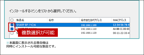 - ※ 本画面に表示される複合機は、同時にインストール可能な製品です。