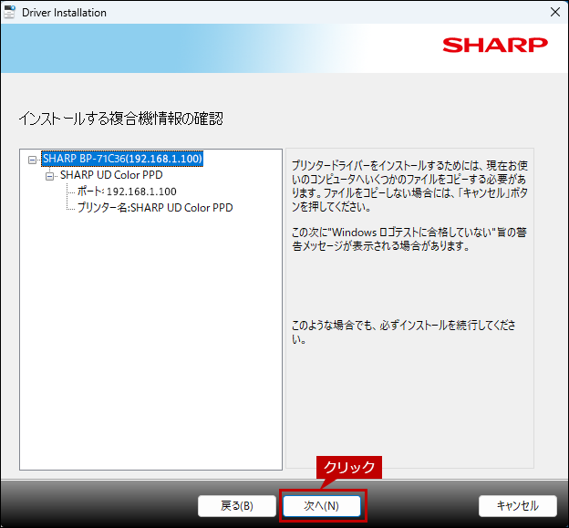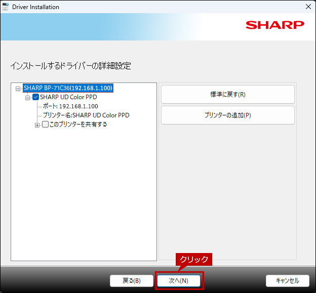 インストールする複合機の詳細設定を確認して、[次へ]をクリックします。