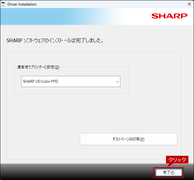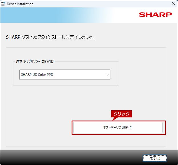 インストールの完了画面が表示されたら[テストページの印刷]ボタンをクリックして、テストページが印刷されるか確認します。