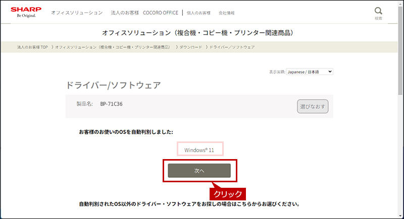 お使いのパソコンのOSが自動判別されますので[次へ]をクリックします。