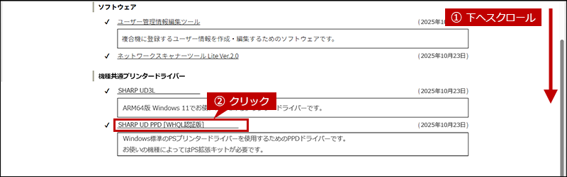 ダウンロード可能なドライバーの一覧が表示されますので、ページを下へスクロールして、[SHARP UD PPD]ドライバーをクリックします。